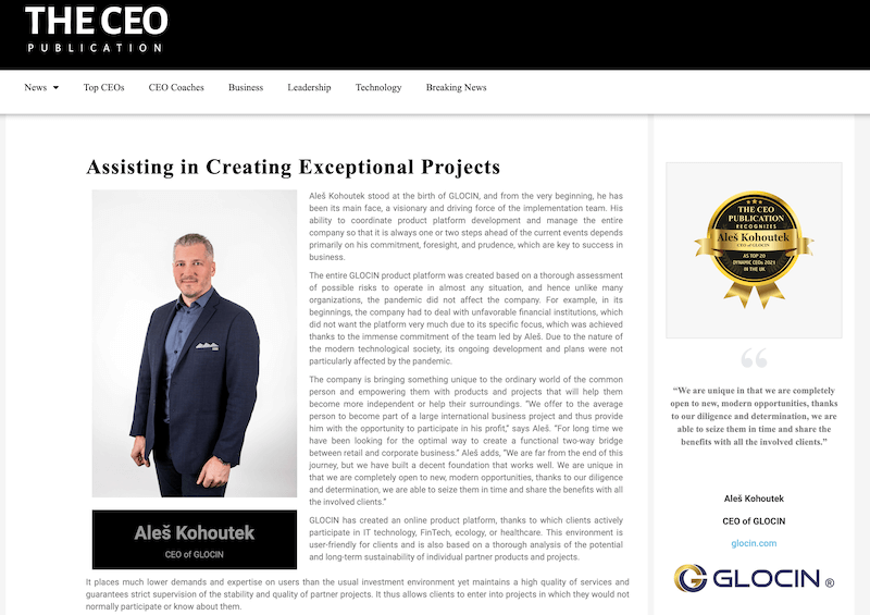 máme tu čest Vás dnes seznámit s novinkou, na kterou jsme my všichni z týmu obchodní platformy GLOCIN nesmírně pyšní. Jak víte, mateřskou společností platformy je firma GLOCIN LIMITED se sídlem ve Velké Británii. V první polovině roku naši mateřskou firmu oslovila redakce britského renomovaného magazínu THE CEO PUBLICATION, který sleduje podnikatelské dění v celé Velké Británii, s žádostí o rozhovor s CEO společnosti Alešem Kohoutkem. Již to samo o sobě je projevem velké pocty a uznání. To největší překvapení však mělo teprve přijít. S nezastíraným potěšením Vám dnes můžeme oznámit, že výkonný ředitel obchodní platformy GLOCIN – Aleš Kohoutek, byl redakcí zařazen do výběru těch nejlepších a byl ve 3. čtvrtletí oceněn jako jeden z TOP 20 nejdynamičtějších CEO 2021 ve Velké Británii! „Toto ocenění pro nás znamená opravdu mnoho! Vnímám je jako odměnu za pět let usilovného budování platformy, otevírání neprošlapaných cest, hledání nových příležitostí a vytrvalého směřování k uznání. Je to skutečně významný milník a velké povzbuzení pro další pokračování. Protože ještě je mnoho před námi, jsme vlastně stále teprve na začátku,“ komentoval ocenění Aleš Kohoutek bezprostředně poté, co se o něm dozvěděl.
